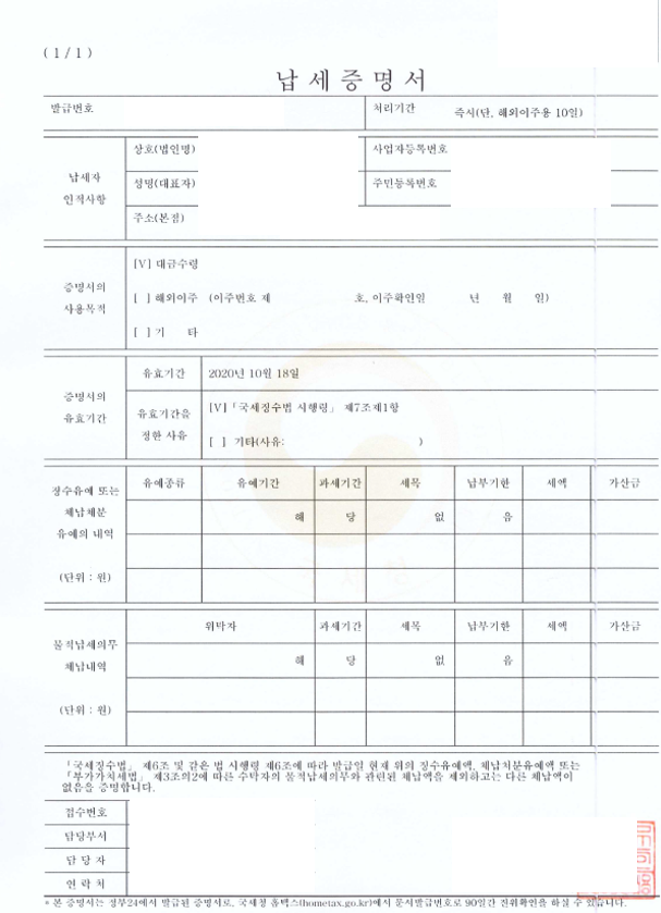 납세증명서의 발급방법은 홈택스나 정부24 중 편하신 곳에서 1부 발급 받으시면 됩니다.