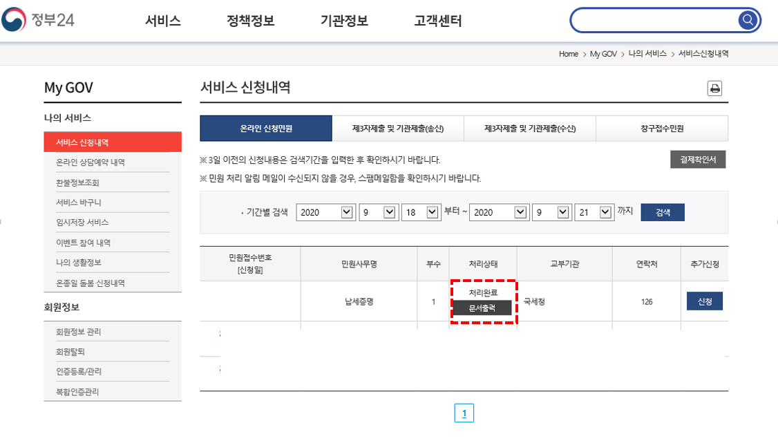6) 서비스 신청내역에서 처리상태 확인후 문서출력 버튼을 클릭합니다.